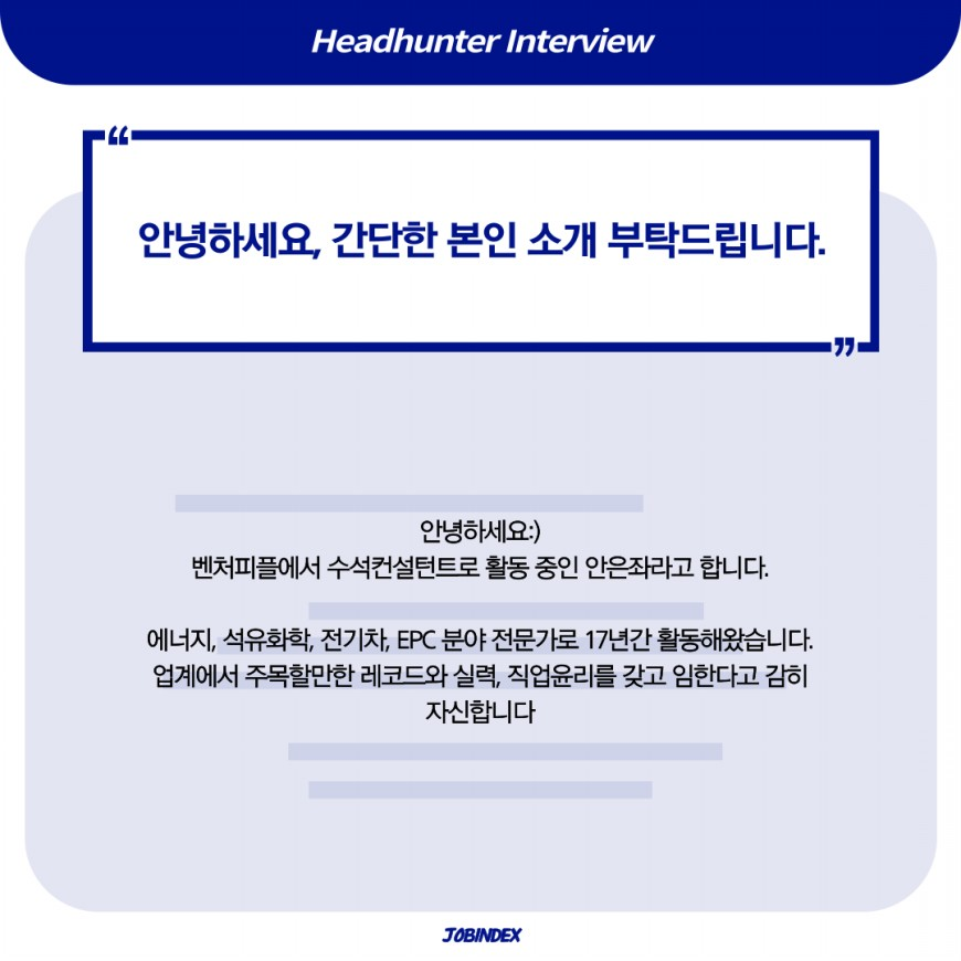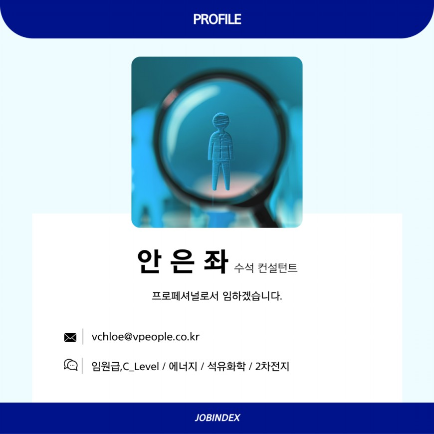 안은좌 헤드헌터님은 주로 임원급, 에너지/석유화학 / 2차전지 등의 핵심인력 스카우트를 전문으로 하고 계십니다.