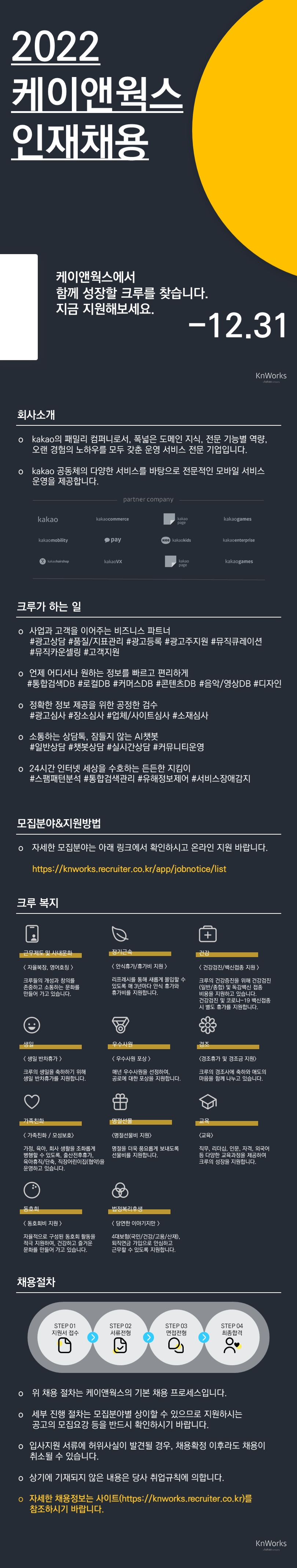 케이앤웍스 신입/경력 채용공고 1,350 0 0 회사개요 : 케이앤웍스 경력레벨 : Junior 급여수준 : 협의 교육수준 : 상관없음 모집기간 : 채용시까지 ● 모집분야&지원방법 자세한 모집분야는 아래 링크에서 확인하시고 온라인 지원 바랍니다. ☞ https://knworks.recruiter.co.kr/app/jobnotice/list #CS#고객상담#고객센터#고객#고객응대#kakao#카카오 외부 채용공고 지원하기 `22.04.26 작성자의 다른 채용공고 [정규직/초기정착금지급] 카카오 모빌리티/주문하기 CS(고객상담/인바운드) 담당자 모집 (`22.05.10) 케이앤웍스 #고객지원#고객상담#고객응대#고객센터#CS