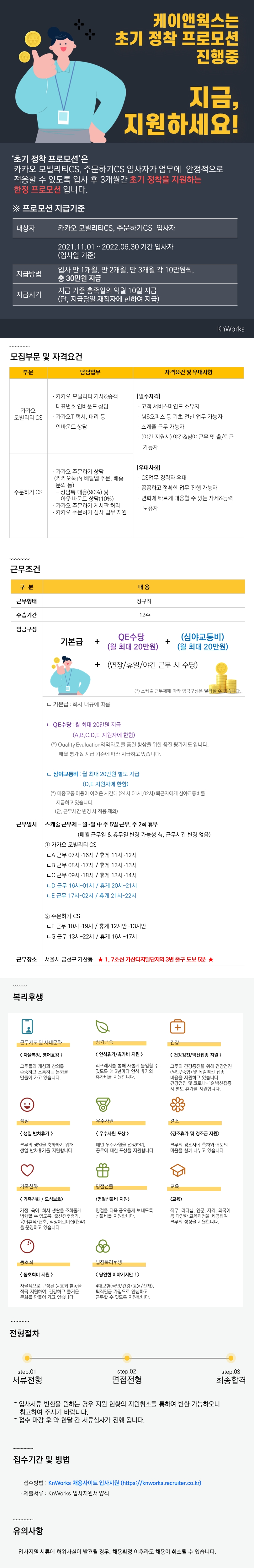 케이앤웍스 신입/경력 채용공고 (`22.04.26) 케이앤웍스 ● 모집분야&지원방법 자세한 모집분야는 아래 링크에서 확인하시고 온라인 지원 바랍니다. ☞ https://knworks.recruiter.co.kr/app/jobnotice/list #CS#고객상담#고객센터#고객#고객응대#kakao#카카오