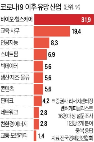 Q. 코로나 이후, 유망 산업은 무엇일까요? 0 추천 비추천 북마크 코로나19가 종식된 뒤 가장 유망할 것으로 전망되는 산업은 무엇일까요? #코로나19#유망산업 `21.07.12 질문 수정 제안 제안 제안 쓰기 확인 취소 1 개의 답변 최신 추천 0 추천 비추천 A.안녕하세요:) 신종 코로나바이러스 감염증(코로나19)이 종식된 뒤 가장 유망할 것으로 전망되는 산업으로 바이오·헬스케어가 꼽혔습니다. 전국경제인연합회는 28일 증권사 리서치센터장과 벤처캐피털리스트들을 대상으로 한 유망 산업 관련 설문조사 결과를 발표했습니다. 이번 조사는 36명의 응답자가 코로나19 이후 유망한 산업 두 가지를 답하는 방식으로 이뤄졌습니다. 원격진료를 포함한 바이오·헬스케어를 꼽은 응답자가 31.9%로 가장 많았습니다. 원격교육, 비대면 근무 등을 아우르는 교육·사무(19.4%) 분야가 뒤를 이었습니다. 이어 인공지능(AI)이 8.3%, 스마트팜 6.9%, 빅데이터가 5.6%였습니다. 자세한 내용은 아래의 표를 참고해주세요! 출처 : https://www.hankyung.com/economy/article/2020042897261 한경닷컴(송형석 기자) 경력직 정보는 JOBINDEX `21.07.12 답변달기 답변달기 답변 등록하기