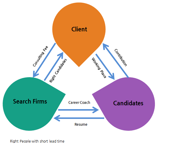 위에서 보시는 것처럼 고객사(Client) , 서치펌(컨설턴트) , 후보자(Candidates)가 이시장에서 3개의 축을 이루고 있습니다. 고객사는 서치펌 혹은 헤드헌터분들에게 채용의뢰를 하게 되고, 서치펌, 헤드헌터는 적정 후보자를 추천하고 고객사로 부터 수수료를 받게 됩니다. 서치펌에 속한 헤드헌터는 후보자에게 커리어코징을 해주며, 후보자는 이력서 dB를 남겨주게 되는 것이지요~ 물론 후보자는 회사에 직접 지원하고 일자리를 얻을 수도 있습니다.