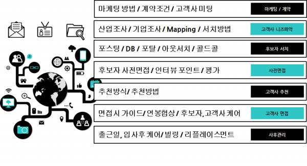 마케팅/계약 -> 고객사 니즈파악 -> 후보자서치 -> 사전면접 -> 고객사 추천 -> 고객사면접 -> 사후관리 순으로 요약되어 집니다.