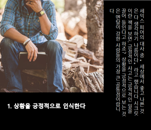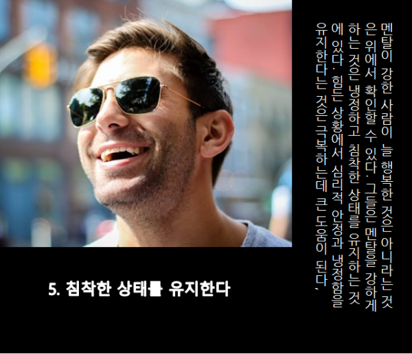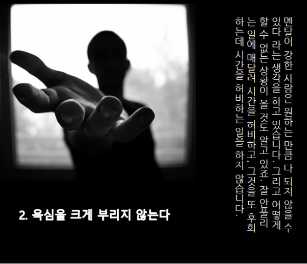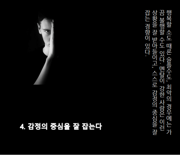 가끔 보면 멘탈 갑인 사람들이 있죠? 그들은 어떻게 그런 정신력을 유지할 수 있을까요? 그들의 삶은 무엇이 다를까요?