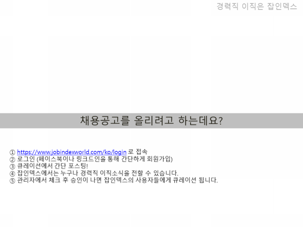 채용을 담당하는 인사직원분이나, 헤드헌터분들, 심지어 요즘에는 부서의 동료를 뽑기위해 잡포스팅을 하는 경우가 늘어가고 있습니다. 잡인덱스에서는 경력직 이직에 대한 정보라면 누구나 자유롭게 정보를 나눌 수 있답니다. 아래 간단 포스팅 방법을 참고해보세요~
