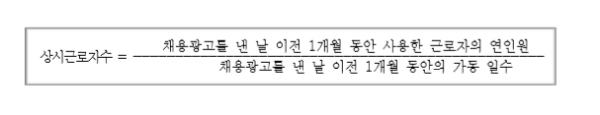 ‑ 한편 이 법은 부칙 제 2조에 따라 이 법 시행 후 최초로 개시 되는 채용절차부터 적용하므로 채용광고 또는 구인공고를 낸 날을 법 적용 사유 발생일로 보고 이전 1개월 동안 사용한 근로자의 연인원을 같은 기간의 가동 일수로 나누어 산정함 (기업 규모에 따른 각각의 시행일이 경과하더라도 채용절차가 개시되지 않을 경우 적용하지 않음)