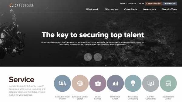 <커리어케어 홈페이지, 영문으로 대부분 표시, 글로벌성을 나타내고자 하는 것 같음>