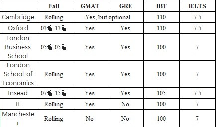 지원을 일찍 할수록 유리한 과정이 많고, GMAT 대체 가능한 자격시험, 경력을 요구하는 과정 등