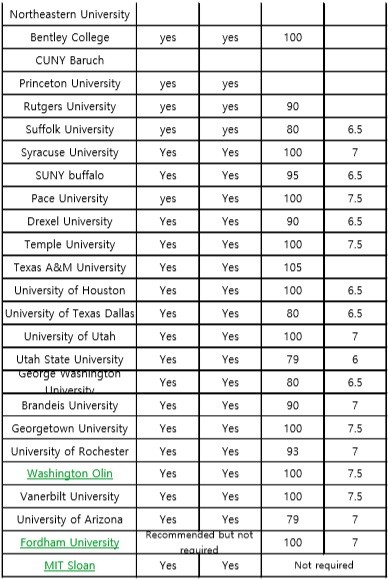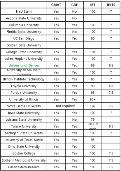 대개는 GMAT 이나 GRE 를 동일하게 보지만, 선호하는 시험 종류를 명시하는 학교도 있으며, GMAT / GRE 시험이 자격증으로 대체되는 학교도 간혹 보입니다.