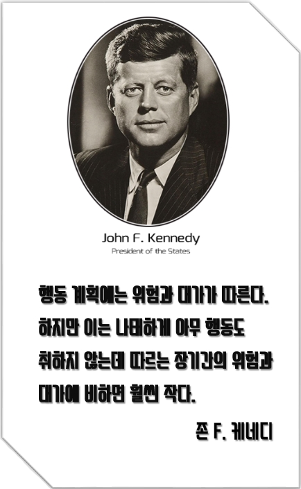 오늘의 명언_존 F. 케네디 12,243 0 1 행동 계획에는 위험과 대가가 따른다.하지만 이는 나태하게 아무 행동도 취하지 않는데 따르는장기간의 위험과 대가에 비하면 훨씬 작다.「존 F. 케네디」 `19.03.28(updated. `19.03.29) 다음글외국계 기업의 영어면접, 어디까지 준비해야 할까요? 이전글상품 개발업 Q&A