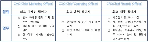 CMO, COO, CFO란? 14,689 0 0 채용공고를 보다보면 CMO, COO, CFO 이란 단어를 간혹 보실 수 있으신데요,오늘은 CMO, COO, CFO의 정의와 어떤 업무를 수행하는지에 대해 간단히 표로 정리해 보았습니다 ! `19.04.25 다음글SCM은 무슨 일을 할까? 이전글프론트엔드와 백엔드의 간단한 개념정리