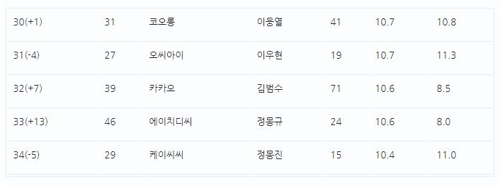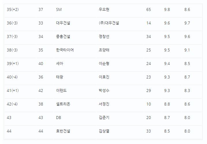 거의 변동이 없는 1위~9위, 한화가 지에스를 넘어선것이 이슈, 사업포트폴리오의 차이?