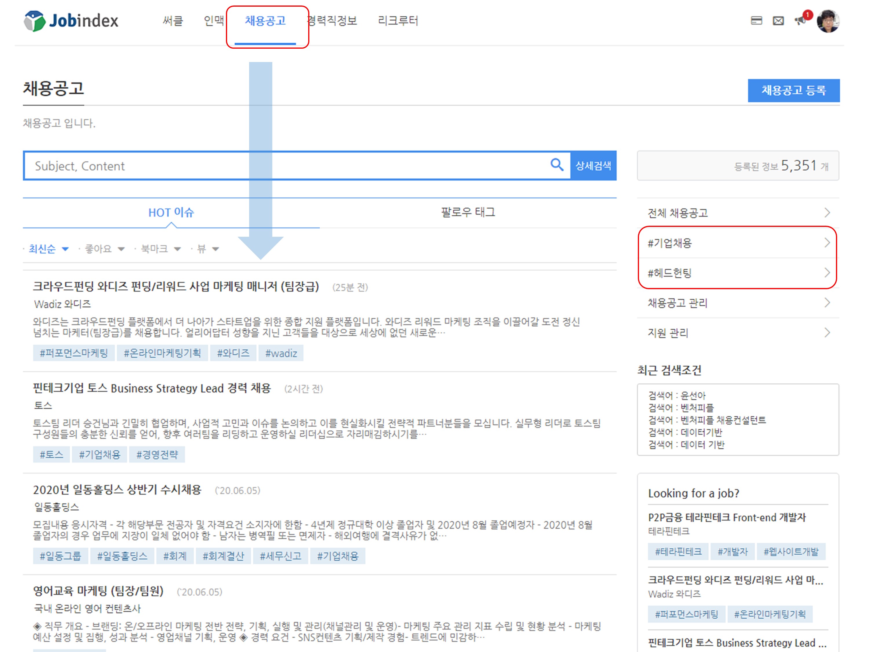 태그를 통해 기업채용과 헤드헌팅 채용정보를 구분해서 보여드리며, 세부적으로 과업별 태그를 통해 좀 더 구체적으로 나에게 부합하는 채용정보를 필터링할 수 있도록 도와드립니다.
