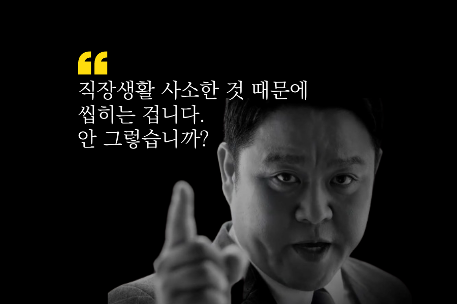 김구라가 말하는 직장생활 조언! 10,527 0 2 회사 내에서 내 의견을 내새우지 못할 망정 무시당하고 있다면..? "만만하게 보니까 이것저것 다하는거야" 남들이 까칠하다고 흉볼지더라도 내 맘 편하게 직장생활하는 법 김구라가 말하는 직장생활 조언! `20.06.29(updated. `20.06.29) 다음글직장인들을 위한 스트레스 관리법 Top 4! 이전글헤드헌터가 되려면 어떻게 해야할까?