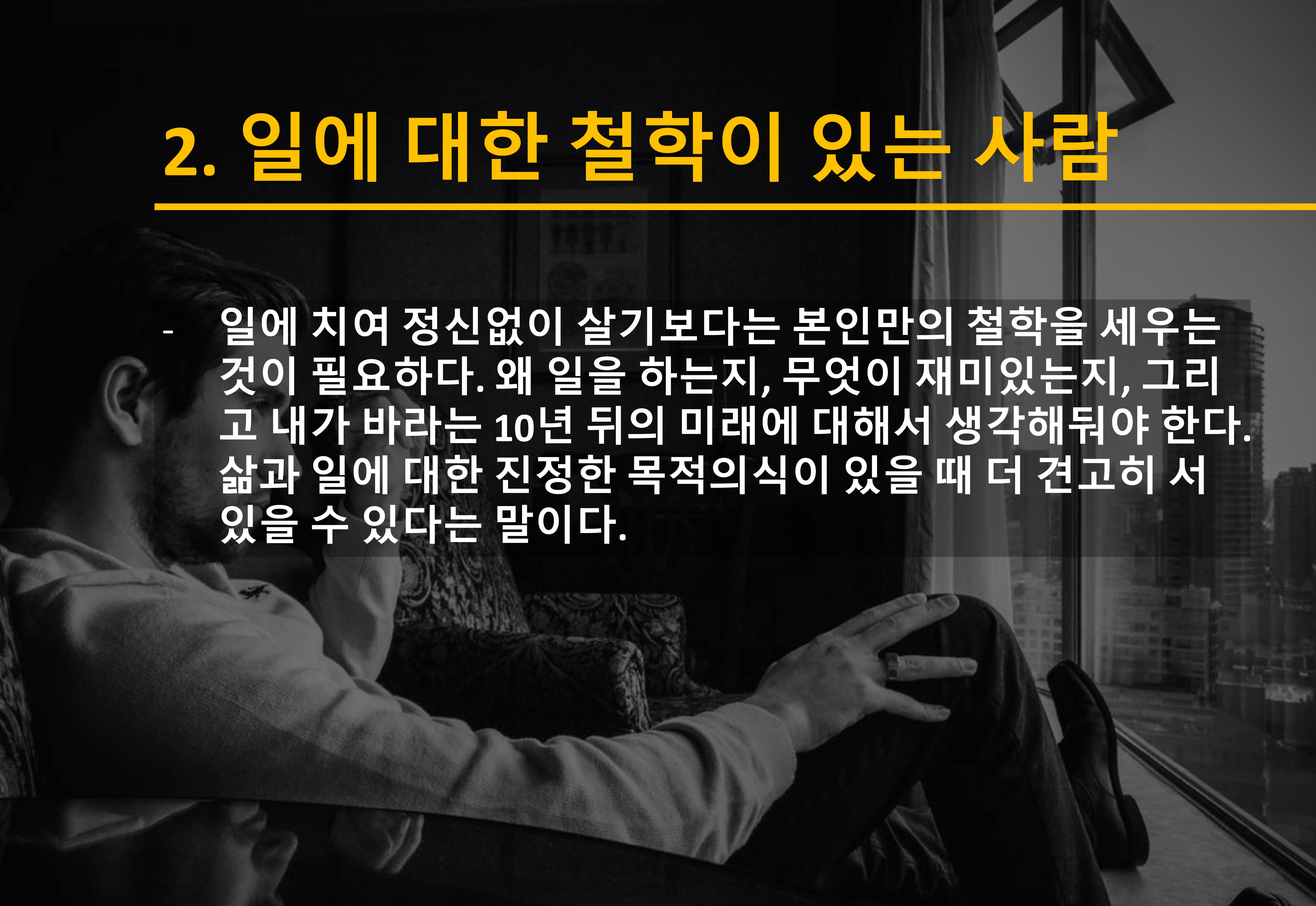 2. 일에 대한 철학이 있는 사람, 아무 의미없이 출퇴근만 해서는 결코 직장생활을 잘 할 수 없습니다.