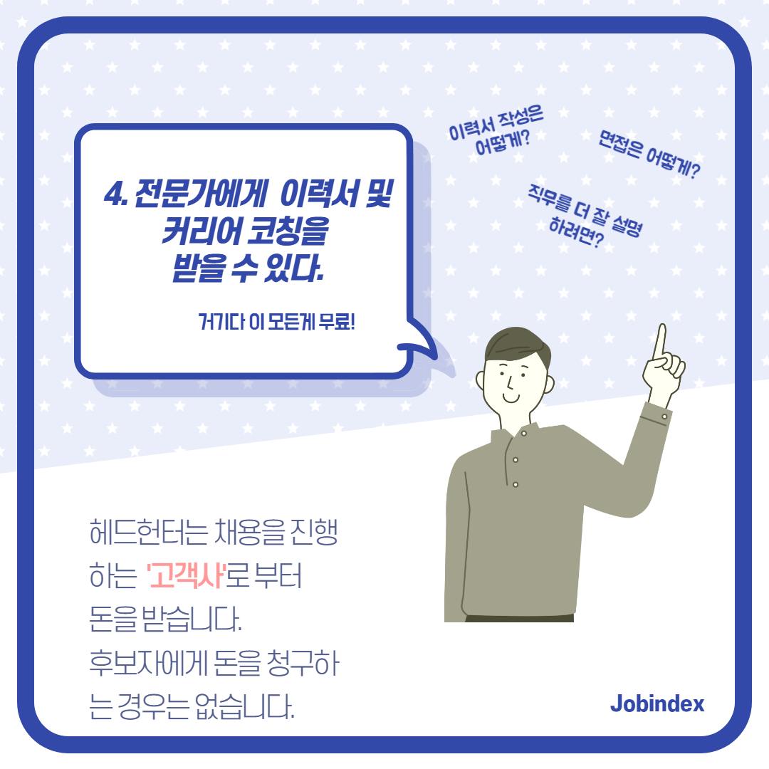 물론 그쪽에서 뽑으려는 직무 Fit과 맞지 않을 수도 있지만 많은 경력직 분들이 이력서 부터 잘못 써서 소중한 인터뷰 기회도 날려버리는 경우가 많다고 합니다. 그래서 이런 것을 커버할 수 있는 헤드헌팅 서비스 정말 유리할까? 라는 부분에 대해 구체적으로 어떤 부분이 있는지 살펴보았습니다~