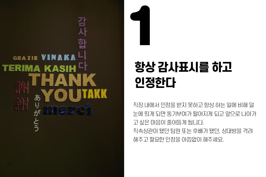 '칭찬은 고래도 춤추게 한다' 라는 말이있죠. 상대방의 능력을 인정하고 고맙다고 표현해주세요. 지쳐있을 때 칭찬을 듣는다면 기대에 부합하기 위해, 좋은 성과를 내기 위해 더 열심히 일하고 싶다는 생각이 들것입니다.