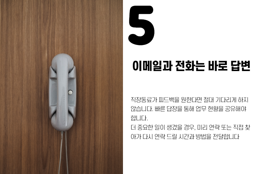 답장이 늦은 것 만큼 답답한 건 없죠. 서로 업무 상황을 보고하거나, 필요한 자료가 있을 때 빠른 회신은 업무의 효율을 높혀줍니다. 또한, 부재 상황일 때는 꼭 팀원에게 미리 말해 혼돈이 없도록 해야합니다.