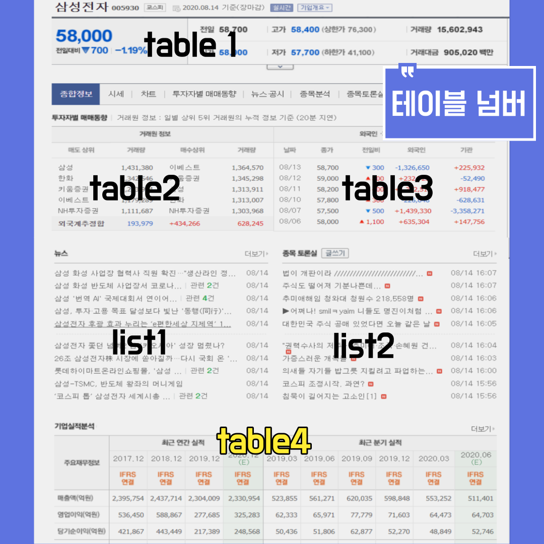 원하는 데이터의 속성이 테이블( 표) 인지 리스트(리스트인지) 확인합니다.
