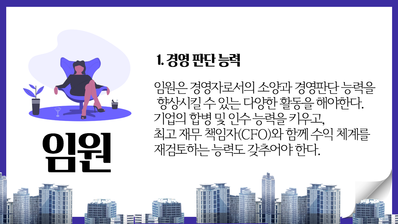 3. 차장 부장급은 팀원을 이끌고 신규 프로젝트를 기획하는 능력이 필요하다. 또한, 자신이 담고 있는 전문 분야뿐만 아니라 다양한 인재들과 교류해 인적 네트워크를 쌓자!