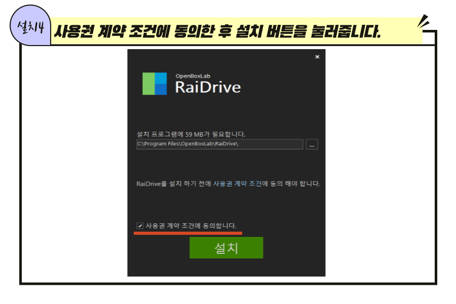 4. 설치 마법사가 시작됩니다. 사용권 계약 조건에 동의한 후 설치 버튼을 눌러줍니다.