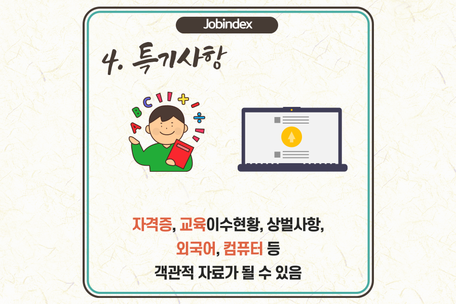 자격증, 교육이수현황, 상벌사항, 외국어, 컴퓨터 등
