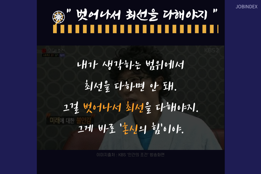 2. "내가 생각하는 범위에서 최선을 다하면 안 돼. 그걸 벗어나서 최선을 다해야지. 그게 바로 '혼신의 힘'이야."