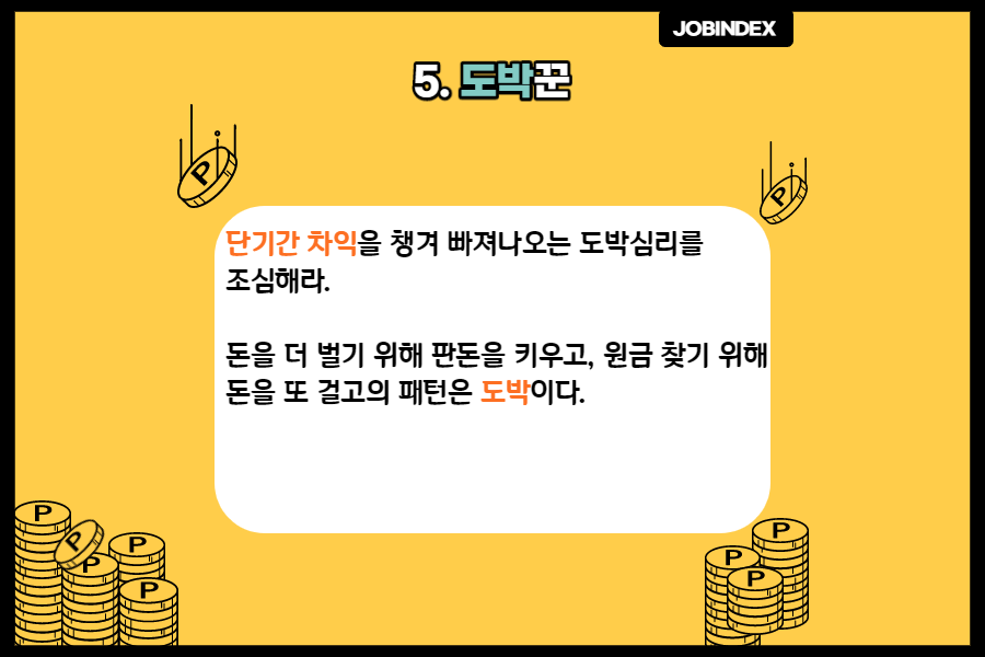 돈을 더 벌기 위해 판돈을 키우고, 원금 찾기 위해 돈을 또 걸고의 패턴은 도박이다.