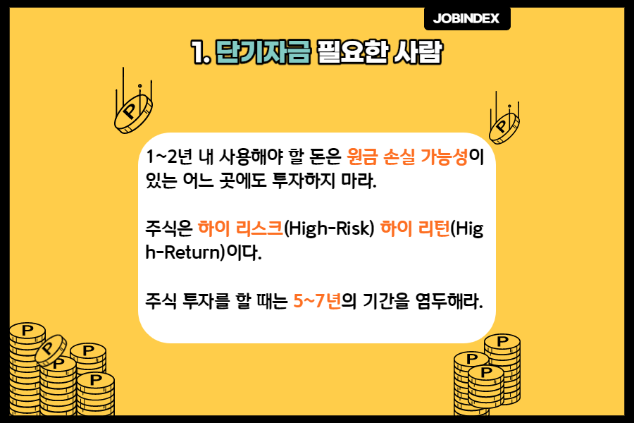 1~2년 내 사용해야 할 돈은 원금 손실 가능성이 있는 어느 곳에도 투자하지 마라.