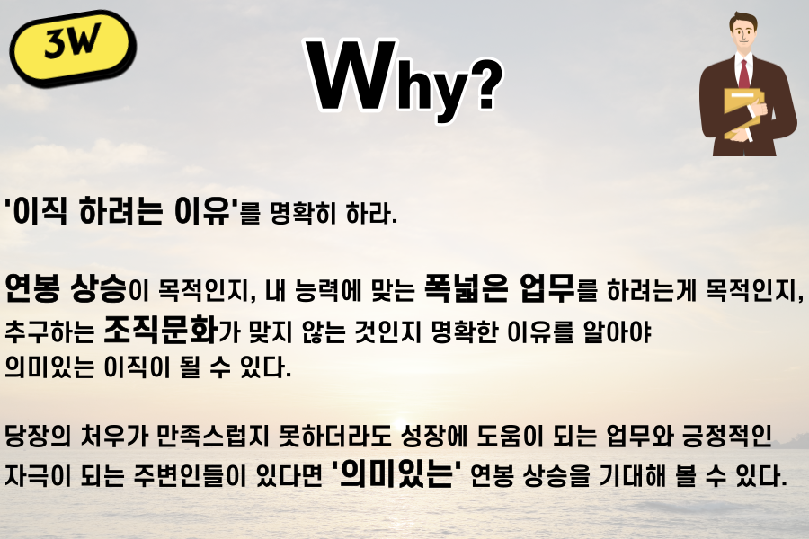 - 연봉 상승이 목적인지, 내 능력에 맞는 폭넓은 업무를 하려는게 목적인지, 추구하는 조직문화가 맞지 않는 것인지 명확한 이유를 알아야 의미있는 이직이 될 수 있다.