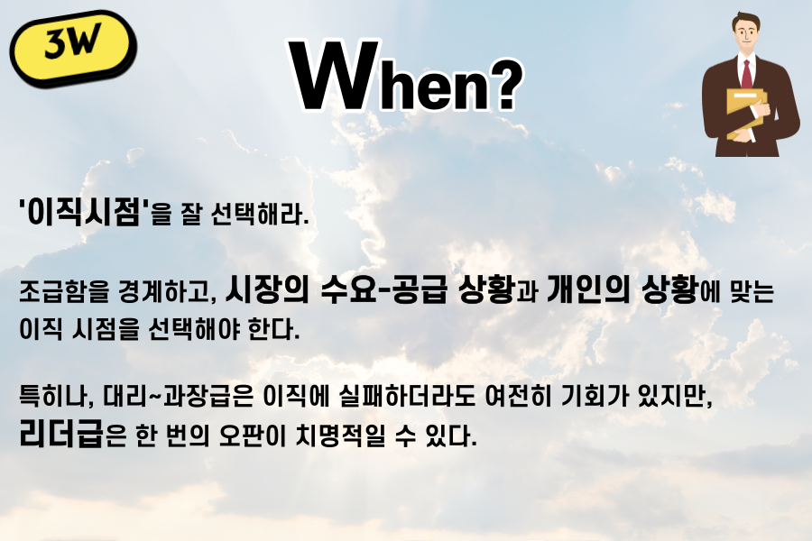 - 조급함을 경계하고, 시장의 수요-공급 상황과 개인의 상황에 맞는 이직 시점을 선택해야 한다.