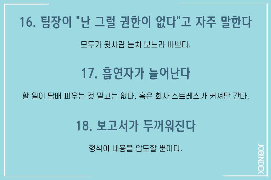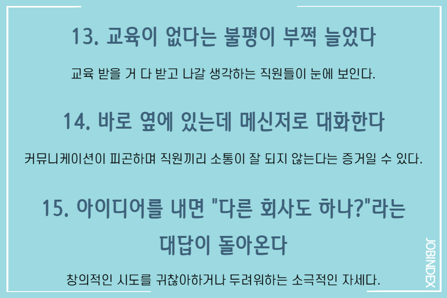 커뮤니케이션이 피곤하며 직원끼리 소통이 잘 되지 않는다는 증거일 수 있다.