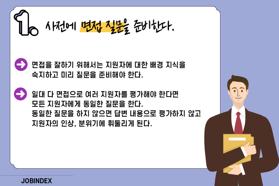 - 면접을 잘하기 위해서는 지원자에 대한 배경 지식을 숙지하고 미리 질문을 준비해야 한다.