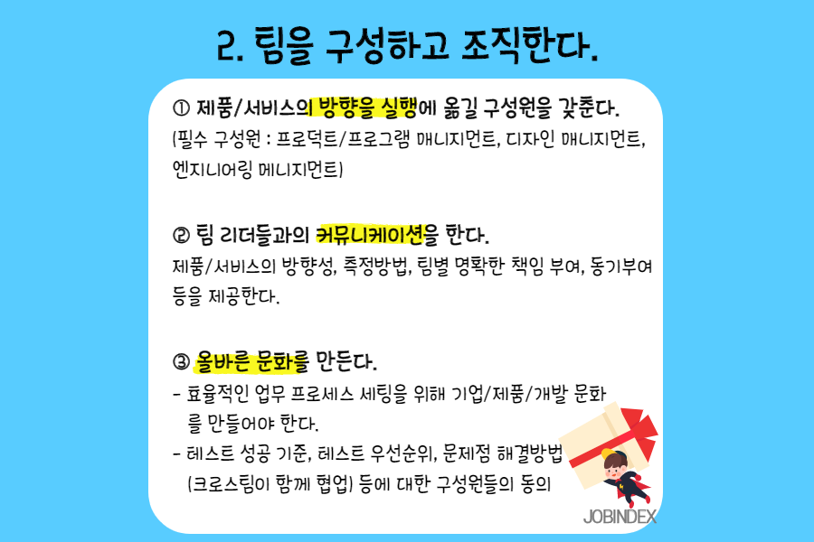 ② 팀 리더들과의 커뮤니케이션을 통해 제품/서비스의 방향성, 측정방법, 팀별 명확한 책임 부여, 동기부여 등을 제공한다.