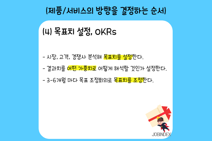 - 시장, 고객, 경쟁사 분석해 목표치를 설정한다.