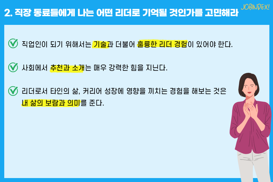 - 직업인이 되기 위해서는 기술과 더불어 훌륭한 리더 경험이 있어야 한다.