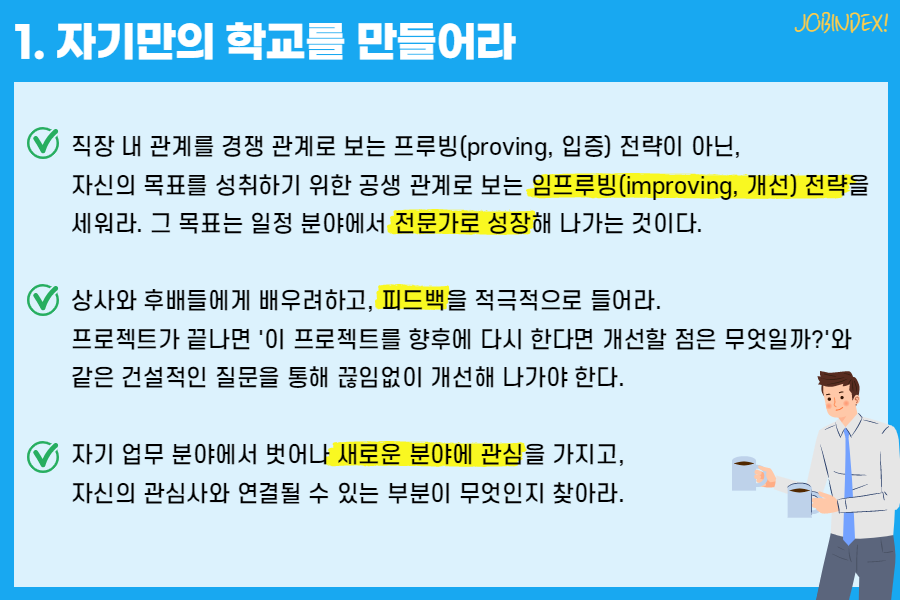 - 상사와 후배들에게 배우려하고, 피드백을 적극적으로 들어라.