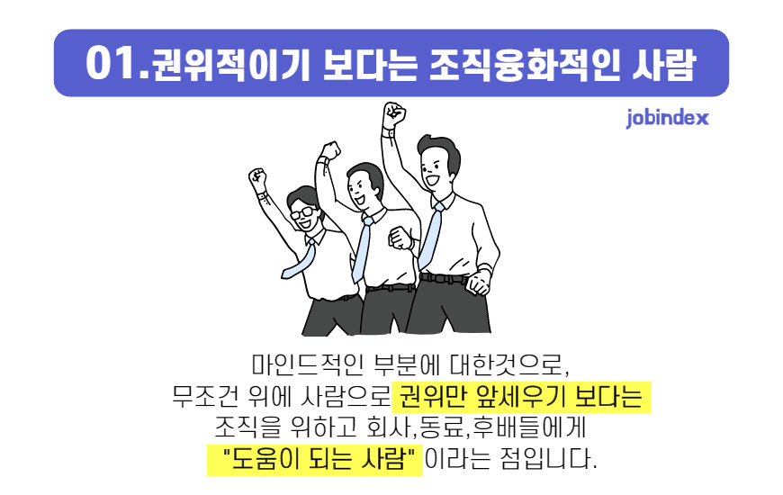 마인드적인 부분에 대한 것으로, 무조건 위에 사람으로 권위만 앞세우기 보다는 조직을 위하고 회사, 동료, 후배들에게 "도움이 되는 사람"이라는 점입니다.