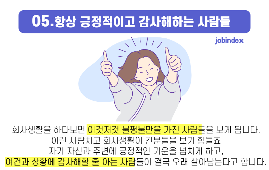 회사생활을 하다보면 이것저것 불평불만을 가진 사람들을 보게 됩니다. 이런 사람치고 회사생활이 긴분들을 보기 힘들죠~ 자기자신과 주변에 긍정적인 기운을 넘치게 하고, 여건과 상황에 감사해할 줄 아는 사람들이 결국 오래 살아남는다고 합니다.