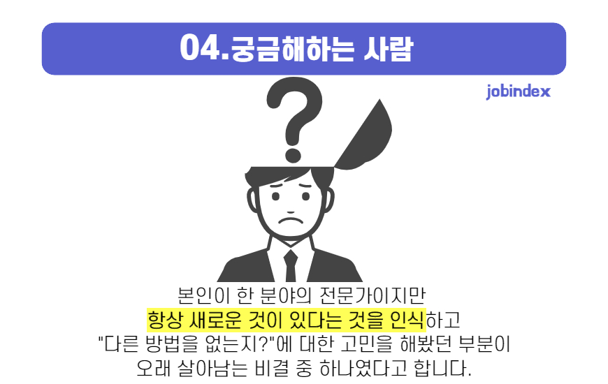 바뀌는 기술이나 환경에 대해 지속적으로 호기심을 가지는 사람들이 오래 살아 남았다고 합니다. 본인이 한 분야의 전문가이지만 항상 새로운 것이 있다는 것을 인식하고 "다른 방법은 없는지?"에 대한 고민을 해봤던 부분이 오래 살아남는 비결 중 하나였다고 합니다.