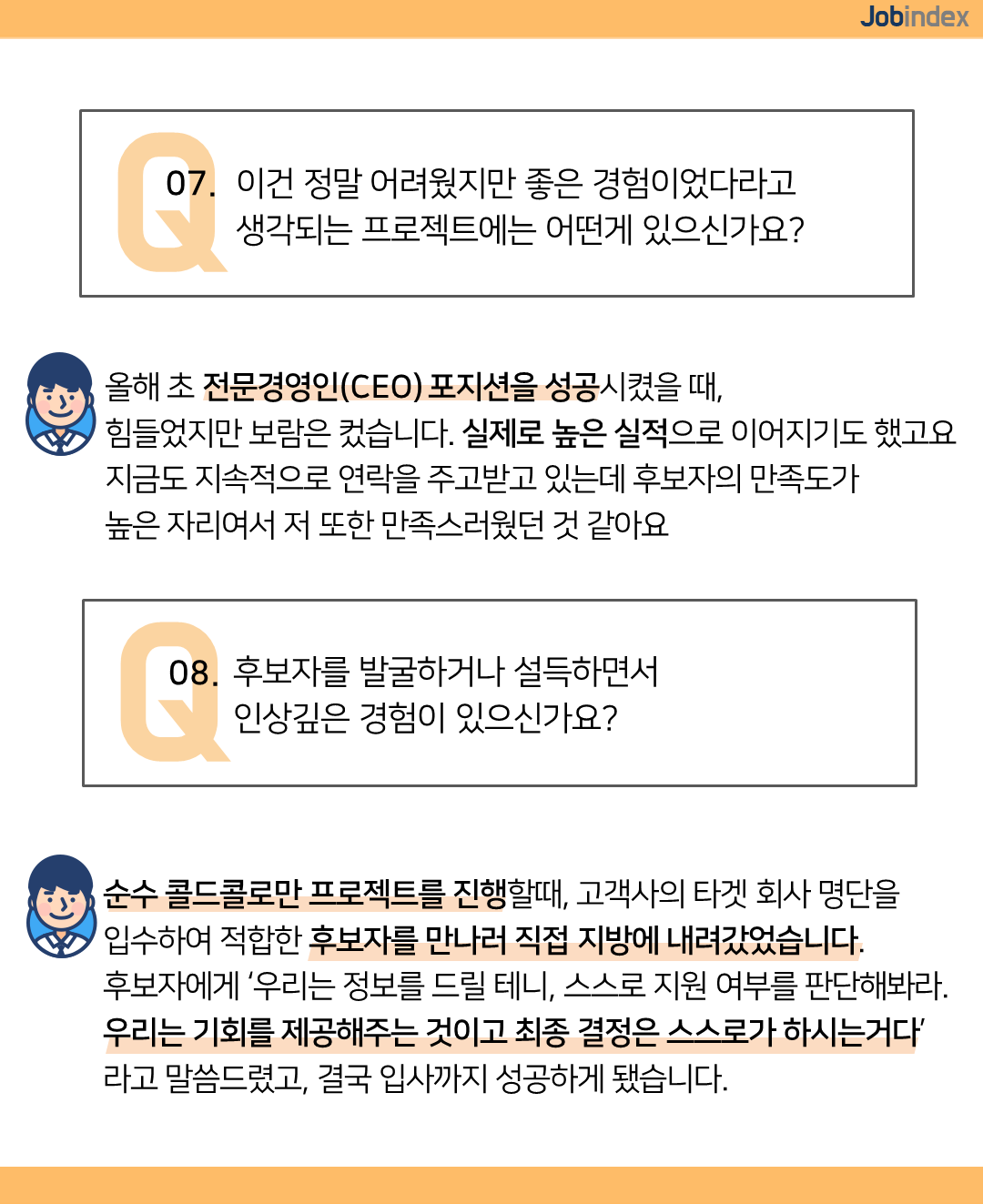 A. 올해 초 전문경영인(CEO) 포지션을 성공시켰을 때, 힘들었지만 보람은 컸습니다. 실제로 높은 실적으로 이어지기도 했고요 지금도 지속적으로 연락을 주고받고 있는데 후보자의 만족도가 높은 자리여서 저 또한 만족스러웠던 것 같아요
