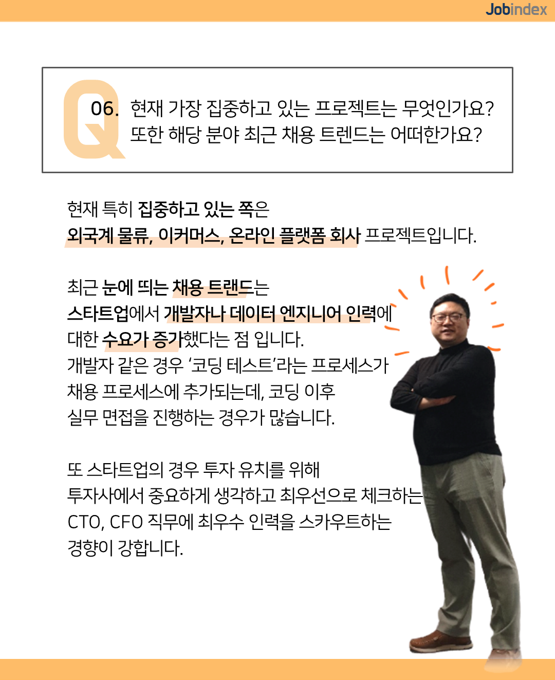 A. 현재 특히 집중하고 있는 쪽은 외국계 물류, 이커머스, 온라인 플랫폼 회사 프로젝트입니다. 최근 눈에 띄는 채용 트랜드는 스타트업에서 개발자나 데이터 엔지니어 인력에 대한 수요가 증가했다는 점 입니다. 개발자 같은 경우 ‘코딩 테스트’라는 프로세스가 채용 프로세스에 추가되는데, 코딩 이후 실무 면접을 진행하는 경우가 많습니다. 또 스타트업의 경우 투자 유치를 위해 투자사에서 중요하게 생각하고 최우선으로 체크하는 CTO, CFO 직무에 최우수 인력을 스카우트하는 경향이 강합니다.