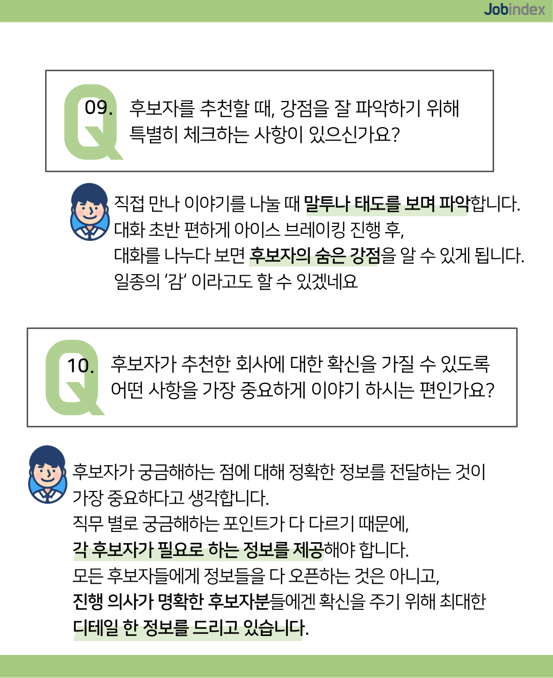 10. Q. 후보자가 추천한 회사에 대한 확신을 가질 수 있도록 어떤 사항을 가장 중요하게 이야기 하시는 편인가요?