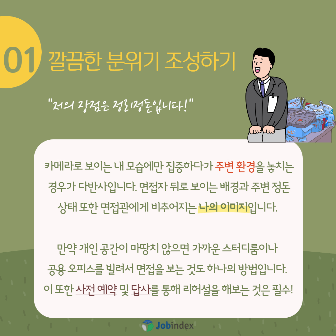 카메라로 보이는 내 모습에만 집중하다가 주변 환경을 놓치는 경우가 다반사입니다. 면접자 뒤로 보이는 배경과 주변 정리정돈 상태 또한 면접관에게 비추어지는 나의 이미지입니다. 주변을 깨끗하게 정리정돈하고 배경은 벽이나 커튼으로 깔끔하게 하는 것이 좋습니다.