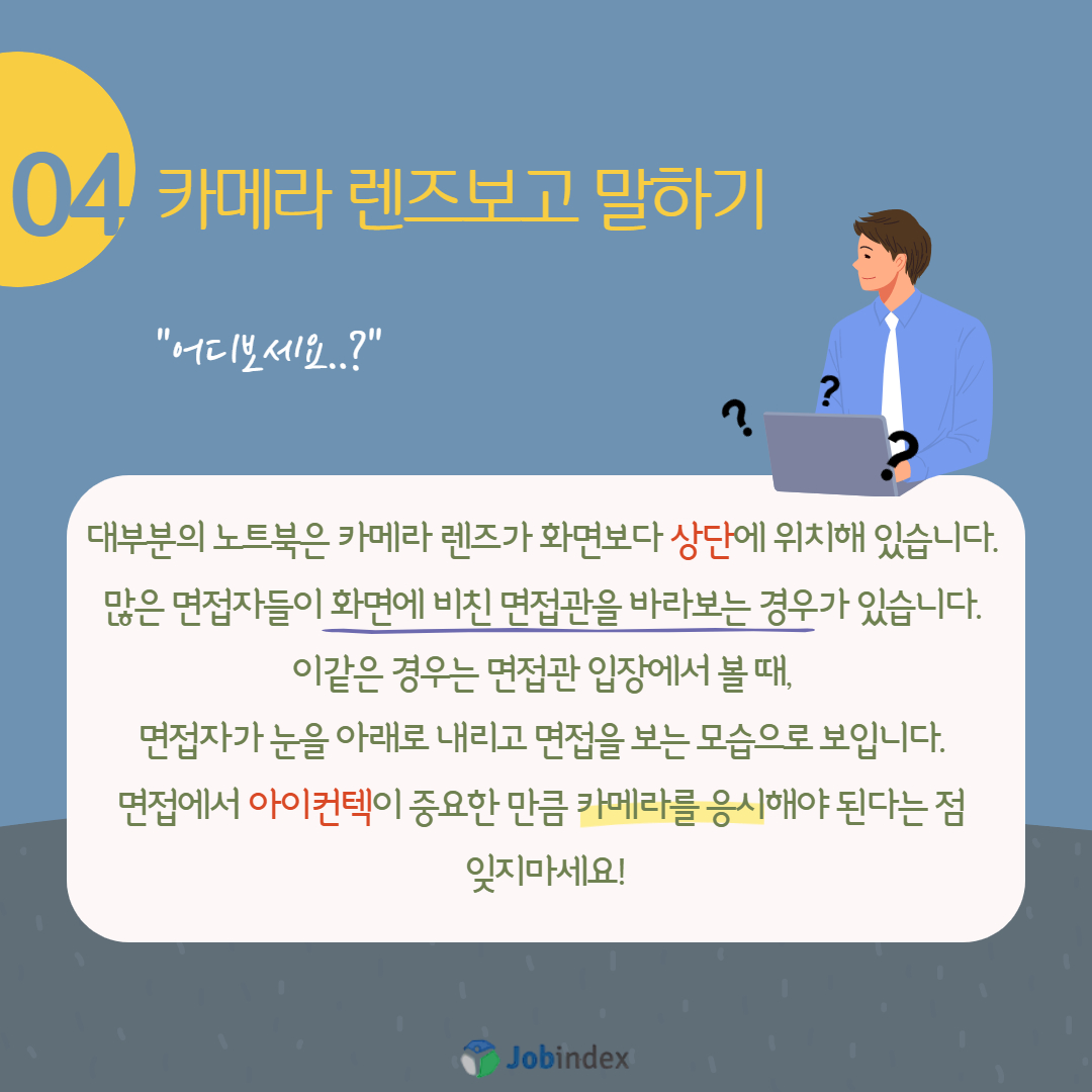 대부분의 노트북은 카메라 렌즈가 화면보다 상단에 위치해 있습니다. 많은 면접자들이 화면에 비친 면접관을 바라보는 경우가 있습니다. 이같은 경우는 면접관입장에서 볼때, 면접자가 눈을 아래로 내리고 면접을 보는 모습으로 보입니다. 면접에서 아이컨텍이 중요한만큼 카메라를 응시해야된다는 점 잊지마세요!