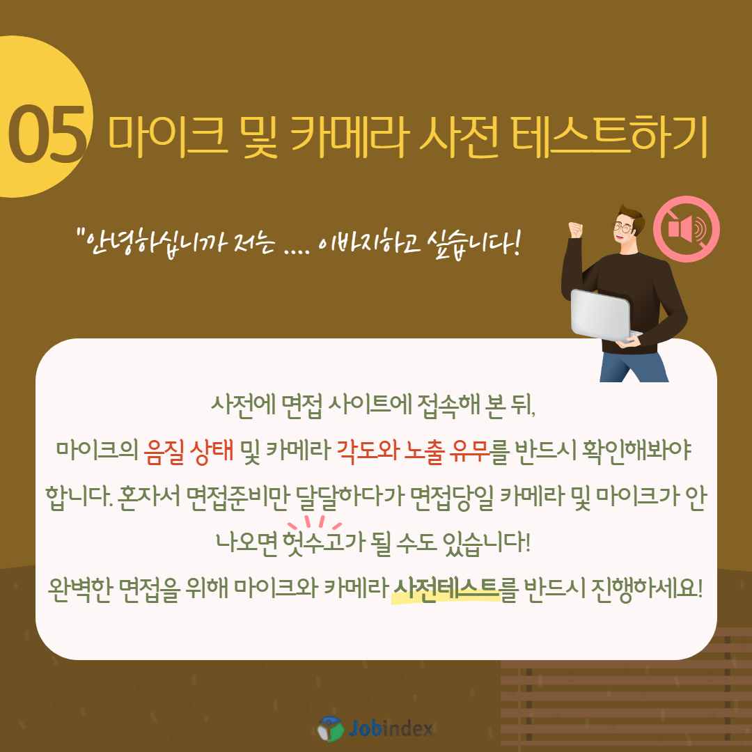 마이크의 음질 및 카메라 테스트가 면접에서 마이너스 혹은 플러스 요인이 될 수 있으니 반드시 사전테스트를 진행하세요!