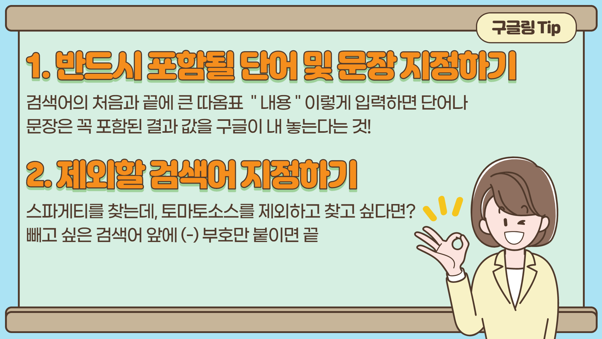 스파게티를 찾는데, 토마토소스를 제외하고 찾고 싶다면? 빼고 싶은 검색어 앞에 (-)부호만 붙이면 끝