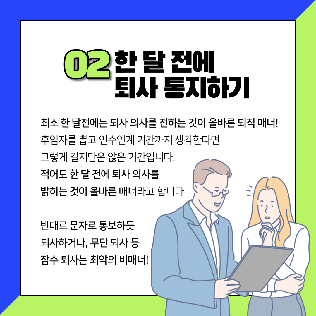 최소 한 달전에는 퇴사 의사를 전하는 것이 올바른 퇴직 매너!