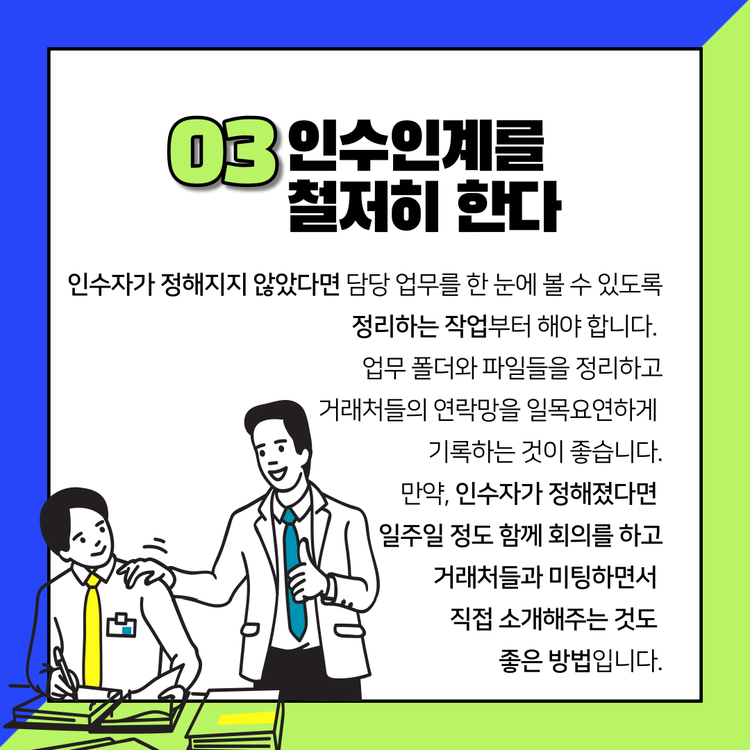 만약, 인수자가 정해졌다면 일주일 정도 함께 회의를 하고 거래처들과 미팅하면서 직접 소개해주는 것도 좋은 방법입니다.