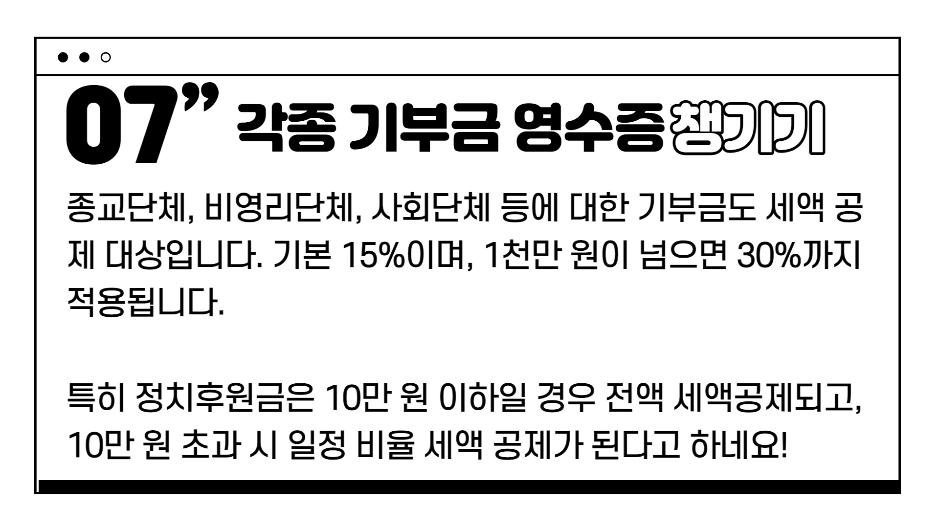 특히 정치후원금은 10만 원 이하일 경우 전액 세액공제되고, 10만 원 초과 시 일정 비율 세액 공제가 된다고 하네요!