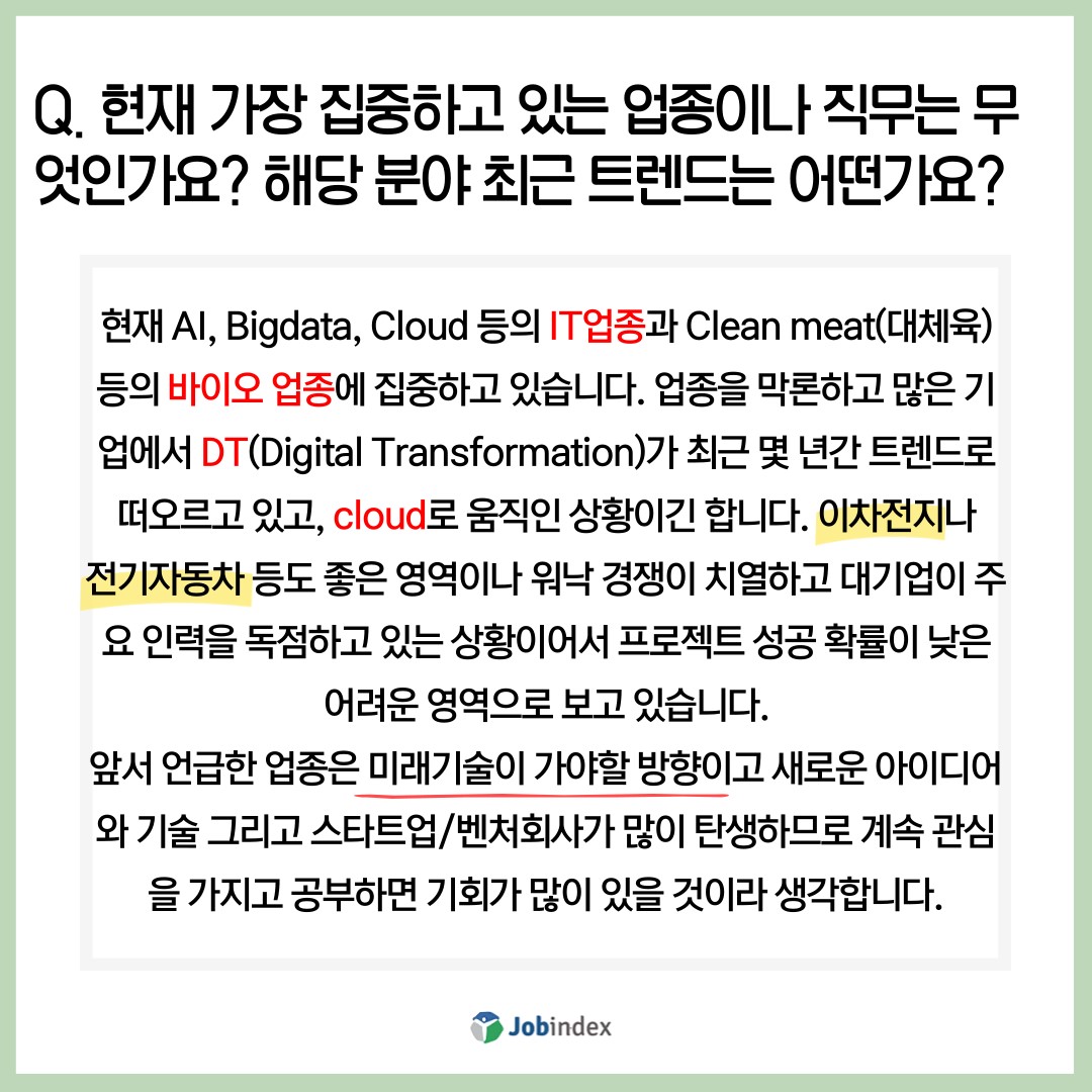 Q. 현재 가장 집중하고 있는 업종이나 직무는 무엇인가요? 해당 분야 최근 트렌드는 어떤가요?